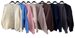 Underbara stickade plagg i mohairull i olika fina mönster och färger.